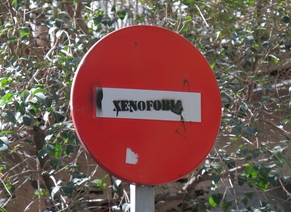 below: There are a few signs that are the work of an unknown person, including this xenofobia stencil.