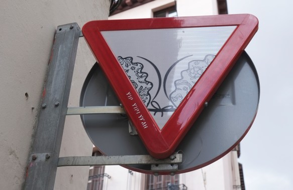 Altered signs in Madrid are the mainly the work of two different artists. The first is a local that goes by the name Yipi Yipi Yeah, or YYY for short. The second is Clet Abraham whose work is found in most large European cities. Searching for these signs can make a game out of walking around a city!