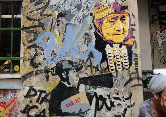 The Cafe Cinema Courtyard starts as a small alley beside the Cafe Cinema off Rosenthaler Strasse close to the Hackescher Market. It is almost completely covered with street art of all kinds – painted murals, stickers, paste ups and more.