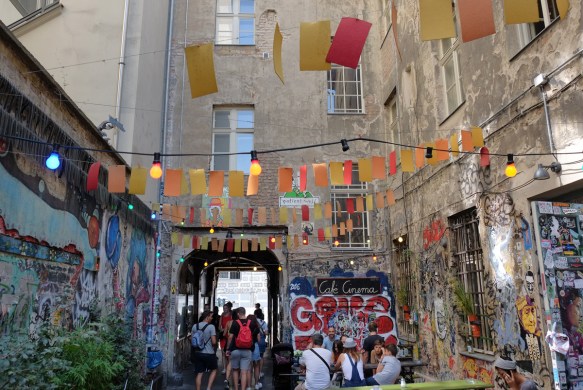 Cafe cinema courtyard in Berlin, one wall is covered with stencils, pasteups, stickers, and small street art, people walking past looking at it and taking picture of it