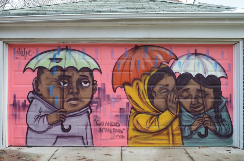 below: Taking cover under umbrellas on a rainy day in a mural by Elicser Elliott
