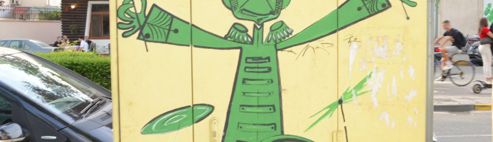 painted sidewalk box on a sidewalk in Tirana, Sargent Pepper cartoon character in green and playing drums, like Ringo Starr