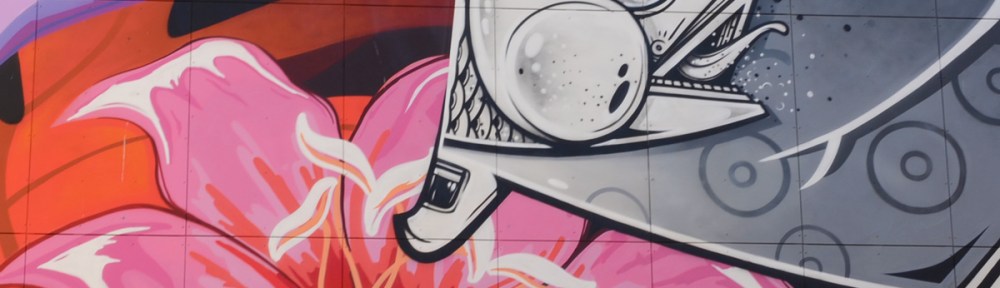 The dominant mural in the top picture, the mural with the brightly colored sun is ‘Sun-Daze’ painted in painted April 2019 by Hownosm. How and Nosm (Raoul and Davide Perré) are identical twin brothers. The lower part of the mural is best seen from street level.