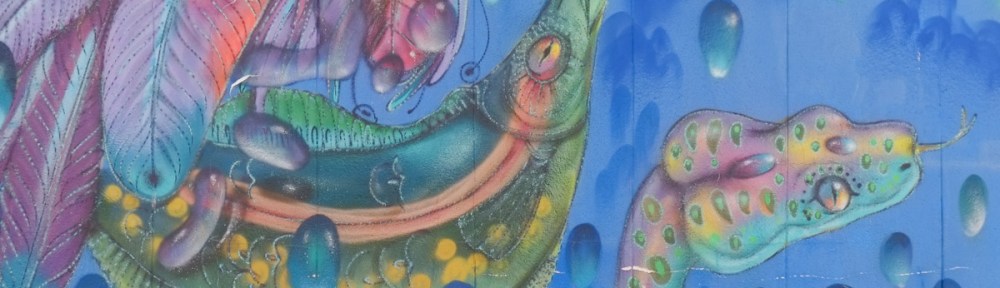 below: A host of creatures in the mural’s mid-section – walking, sitting, swimming, floating.