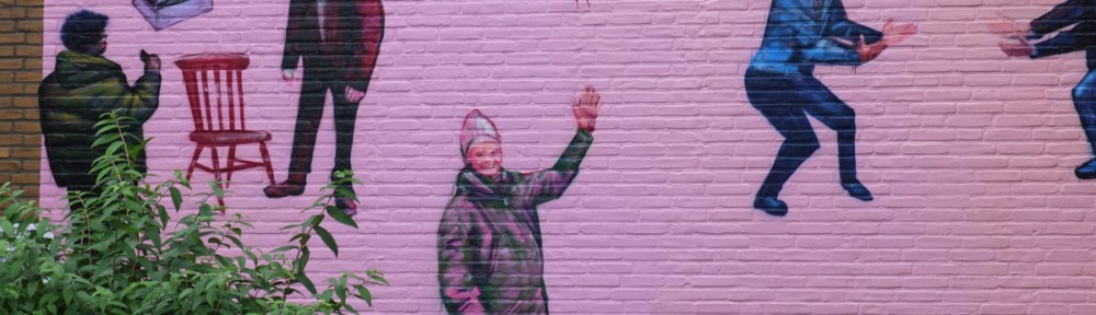 On all four corners of an intersection in a residential area of Heerlen (Netherlands) there is a mural on the side of one of the buildings. They were all painted by the same artist and they all feature some aspect of Dutch culture or history. A pink and purple theme also runs through them all.