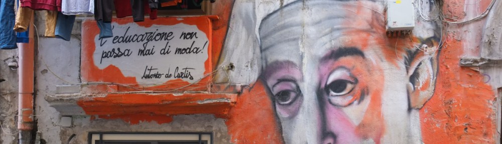 mural in Naples, man's portrait, of Toto the actor, beside a clothes line with laundry, also text in Italian that says L’educazione non passa mai di moda