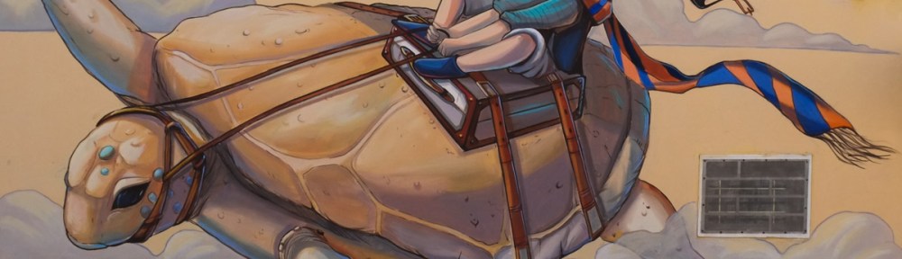 below: “Fly with me” by Alessandra Carloni, 2023. With a suitcase all packed and ready to go, heading out for adventures on a turtle.