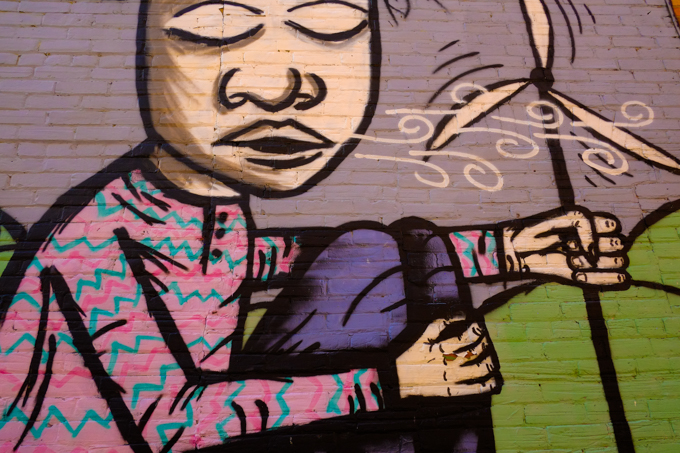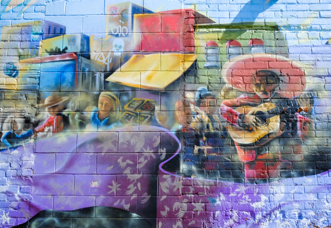 below: This was the first mural that was painted in the alley, a boy and his toys.