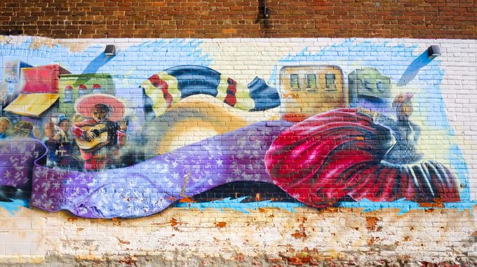 below: There is a large mural behind the Roxy Theatre that was painted to celebrate the 100th anniversary of the theatre. It is composed of a number of theatre related vignettes. It is the result of a collaboration between a number of artists under the leadership of Billy Goodkat.