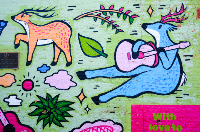 street art mural with words, Owen Sound, and a pink bunny and a blue fish