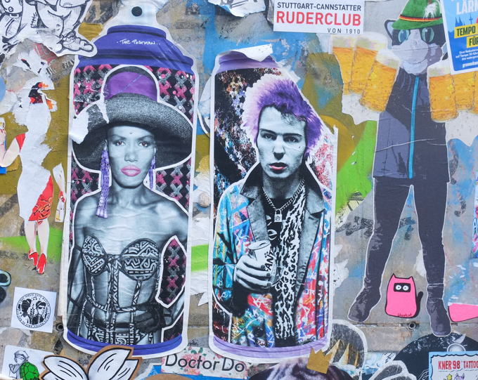 below: The images of people on cans of spray paint is the work of The Postman. Much of his art focuses on celebrities, many of whom, such as Grace Jones and Sid Vicious pictured here, have appeared on these spray paint cans. Tweet cat (now sporting a German fedora) sneaks into the photo too.