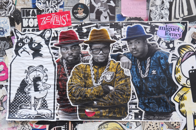below: Cats and rappers. Garfield is on his phone while under a three-eyed cat. The three men are Joseph Simmons, Darryl McDaniels, and Jason Mizell of the hip hop group RUN-DMC. The group was formed in 1983.