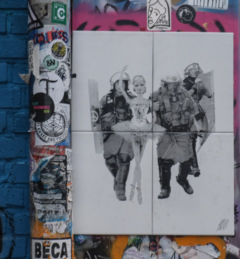 below: Barbie and the riot police. She gracefully dances in her tutu as they haul her away. Graffiti on tiles.