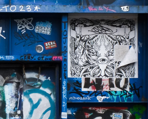 below: On the other side of the entrance, is a wall that has served as a canvas for a few artists.
