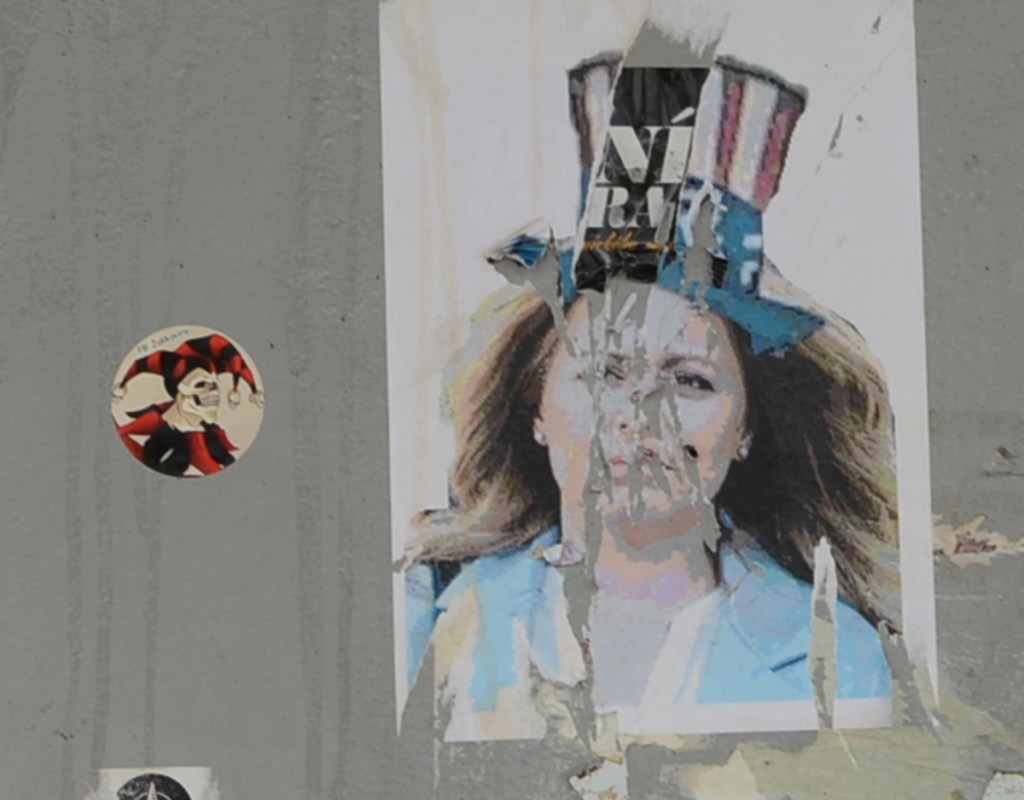 below: I suspect that the Uncle Sam type red and white striped top hat is an insult or a protest.