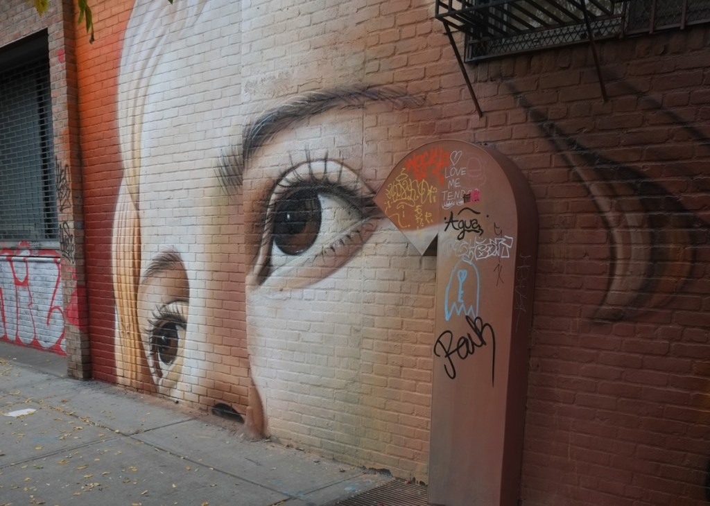 A large mural in Bushwick (Brooklyn) NY called ‘Brick Venus’ was recently painted by two Italian artists, Ligama and Mirko Loste. It features large sculpture-like faces. The face on the righthand side is so large it extends off the top of the wall so that you can’t see her eyes.