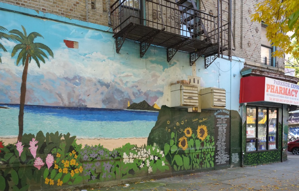 below: Community mural of palm trees and flowers by the lake. Brooklyn Peace Constellation was the work of a long list of artists and contributors.
