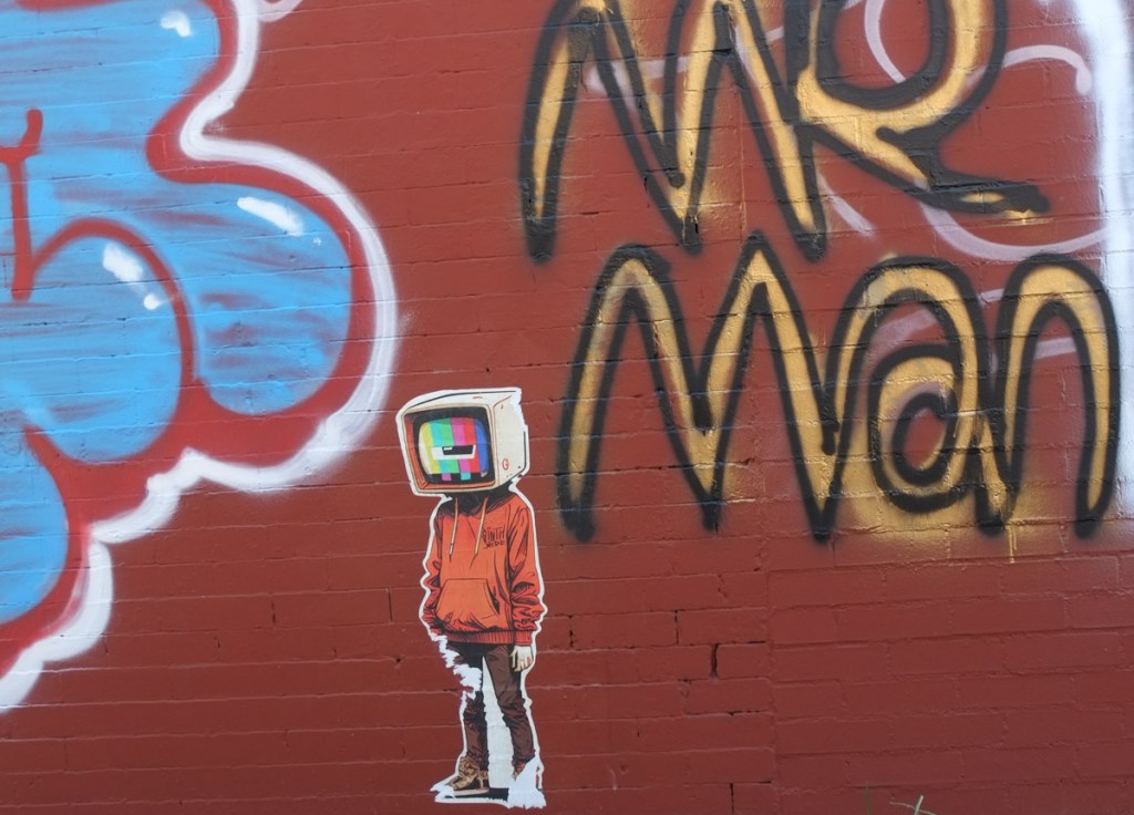 Other “TV heads” were also seen around New York City such as thus downcast and dejected one by Sinth Node (aka Spencer). An old test pattern is on the screen. Once upon a time this is what you’d see on your analogue TV if there was no programming on a given channel (such as in the middle of the night). Now with 24 hour programming these patterns are rarely seen. Also, with technological advances in television, test patterns are rarely needed. When was the last time you adjusted the picture quality of your TV? Perhaps this poor guy just needs an adjustment?