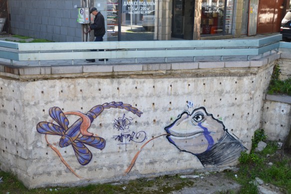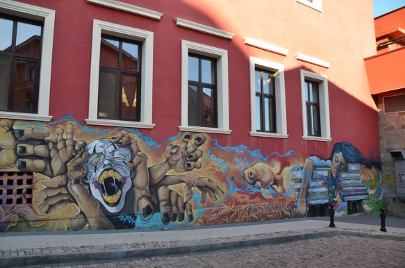 below: Behind the Drama Theatre in Plovdiv, on one of its bright red walls, is a large mural by Bozko. Is this older man in a jester outfit a political statement?