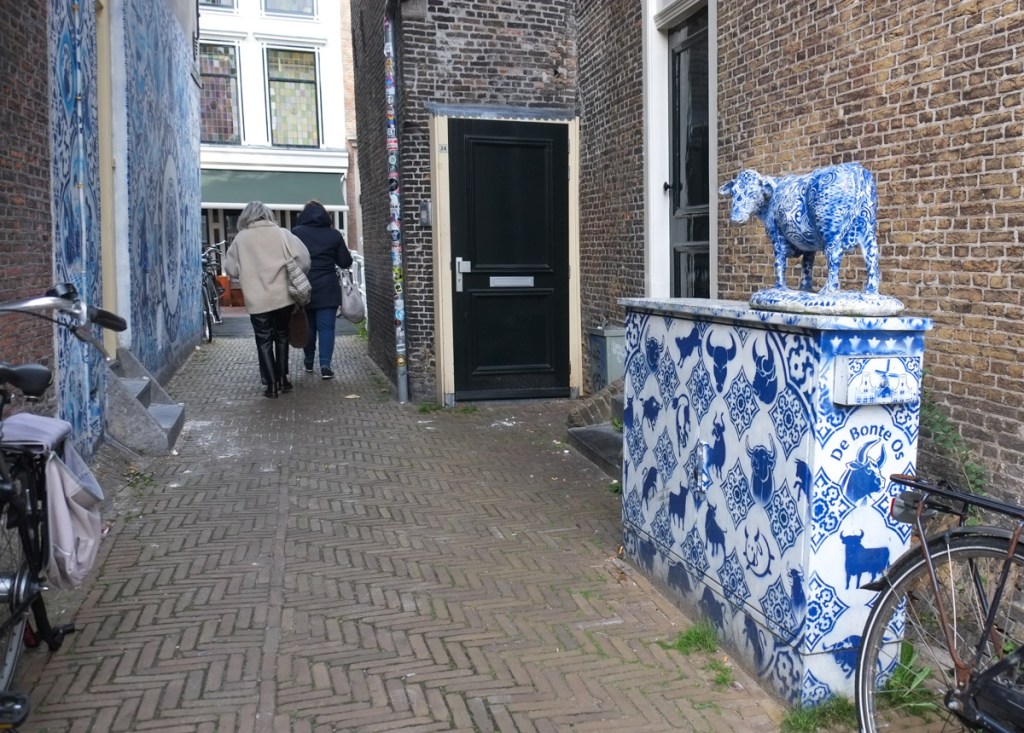 Delft is a lovely city with a large public square by an old church. There are some old houses along a few canals as well as some narrow lanes. There is also some street art there.
