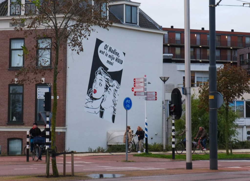 below: “O! Nadine, wat is mijn HUID mooi” or Nadine, my skin is so beautiful (or nice). This replaces a very similar painting that featured a man and a woman with the text, “O Jan wat zit je haar mooi (Jan, your hair is so beautiful”)… But wait…. this is also an ad for beauty products?