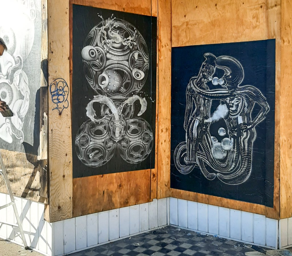 Once upon a time, a very long time ago in fact, it used to be a shoe store on Barton Street. Now it provides exhibit wall space for street art artists. Almost two years ago I showed some photos that were taken here for the Wheat paste anti-gallery, (September 2023). The building still stands and the doors and windows are still covered with plywood. But now that plywood is taking on a life of its own as old wheatpastes fade and tear and new papers are added on top. This is how it looked mid-June 2025.