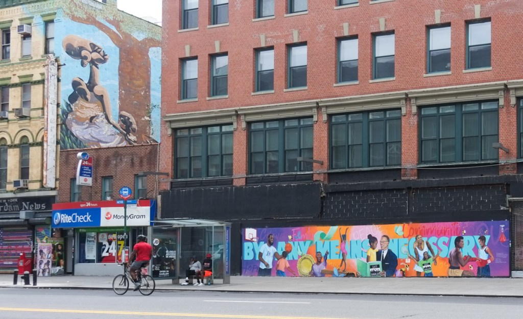 below: There are two large murals along the walls at Adam Clayton Powell Jr. Plaza.