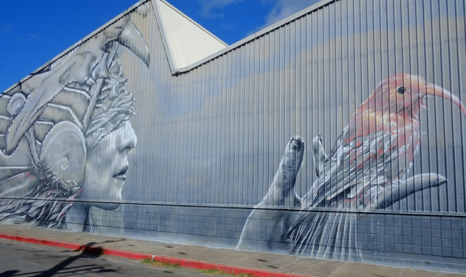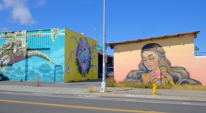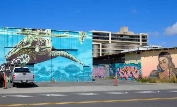 A previous post showed a number of murals that have been painted near the corner of Cooke and Pohukaina Streets in the Kaka’ako district of Honolulu. If you were to stay on Pohukaina Street instead of turning on Cooke, you would walk past another wall of murals. This is that wall. It takes up the whole block.
