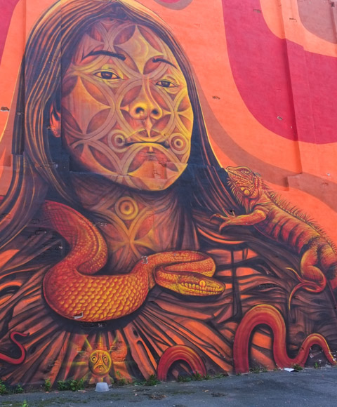 below: “Iguana-boina ” by Rafique aka Rafael Enrique Vega. Here we see the union of the iguana, the symbol of the sun, and “boina”, a dark-colored snake that represents dark rain clouds. From these, life is formed. These elements are found in the Taino creation story where the cave of Iguanaboina was the primordial den from which the Sun emerges to illuminate the earth and to which it returns to hide as the moon emerges. The Taíno people were the predominant indigenous people of the Caribbean.