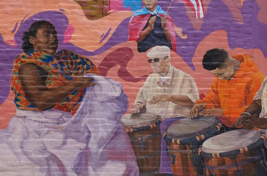 below: A mural on the side of a bakery. Puerto Rica and the USA, Palm trees and sunflowers. Farmers harvesting food from the fields behind the city streets.