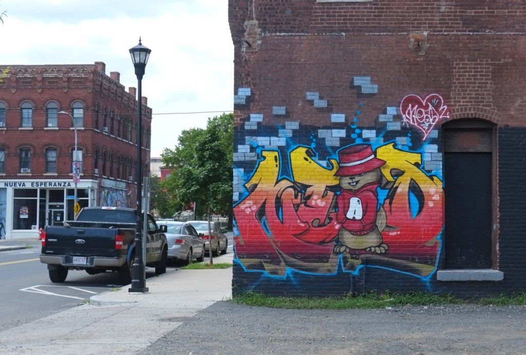 below: Right – The mural says EL ARCOIRIS as a tribute to an after school program created by Nueva Esperanza more than 20 years ago. They use art and murals as part of their program to engage youth. This mural is a tribute to those pioneers and was painted by Golden 305 (aka Cristhian Saravia). Previously, I posted another of his murals in Holyoke