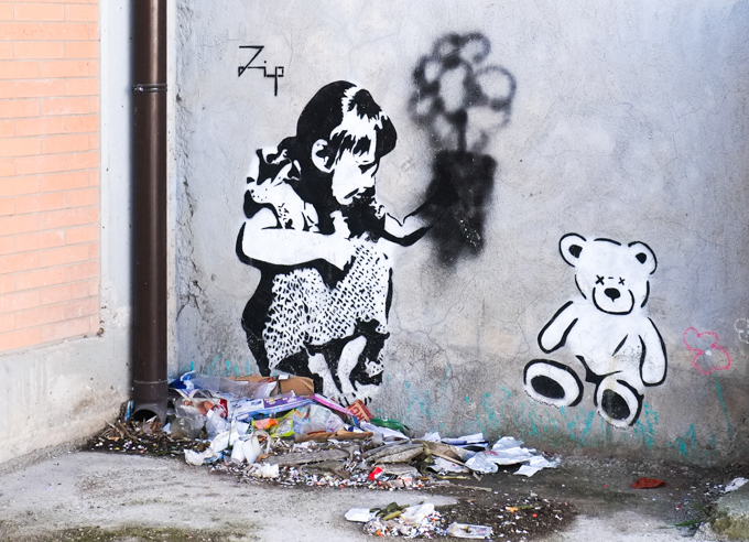 If you walk around the old part of Naples (particularly the Quartieri Spagnoli), you will see many murals and paintings by the Italian duo Cyop & Kaf. Many of them are weathered and faded or written over but they are still hard to miss. This is a selection of the ones that I saw in Naples one wet spring day.