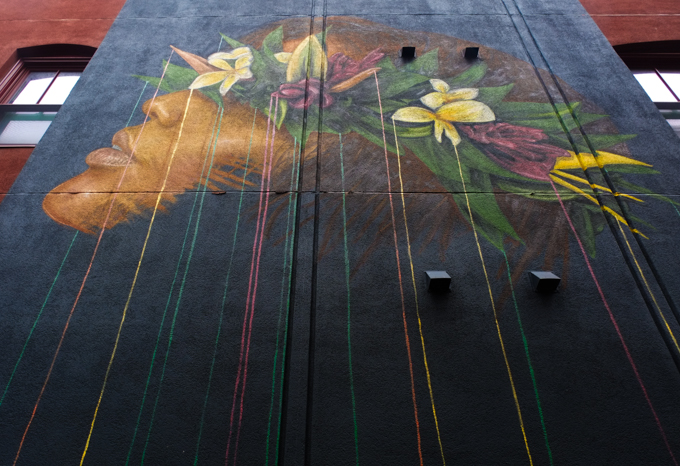 below: From a better angle, the woman in blue with a yellow flower in her hand in the mural by Marka27, aka Victor Quinonez.