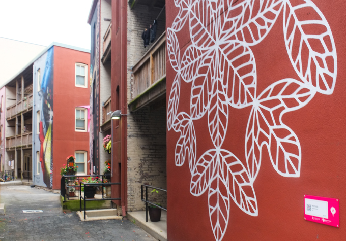below: The shape of leaves, white on reddish brown, in an untitled mural by Veronica Rivera.