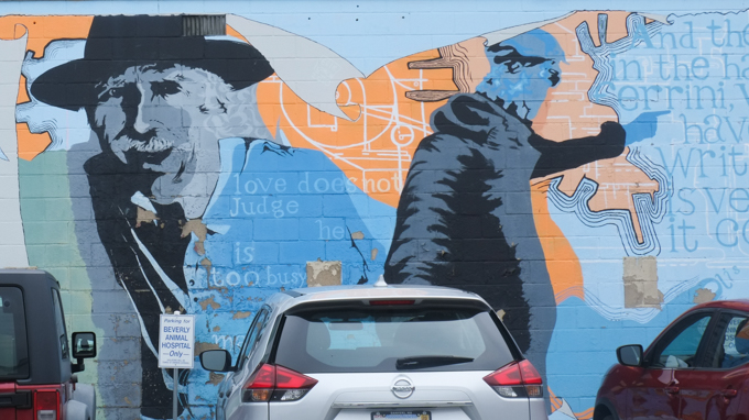 below: One of the first murals painted in Worcester is this now slightly faded creation by Caleb Neelon
