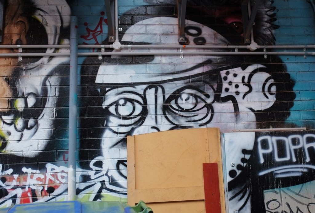A previous blog post showed some of the murals that can be seen in Maiden Lane in Windsor. At the south end of that lane is a parking lot where one more large mural by Enjoy Denial has been painted.