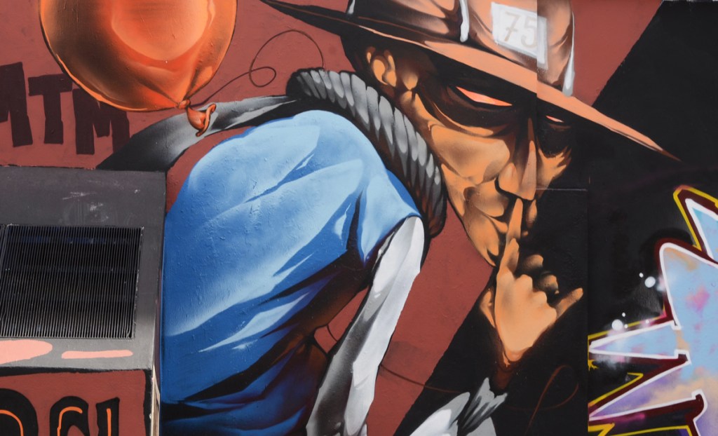 below: Crazy P (= Crazy Partners) creation, a collaboration between a number of artists. First, a skull by Cannibal Letters. Unfortunately, the skull’s white teeth are hidden by the construction rubbish in front of it.