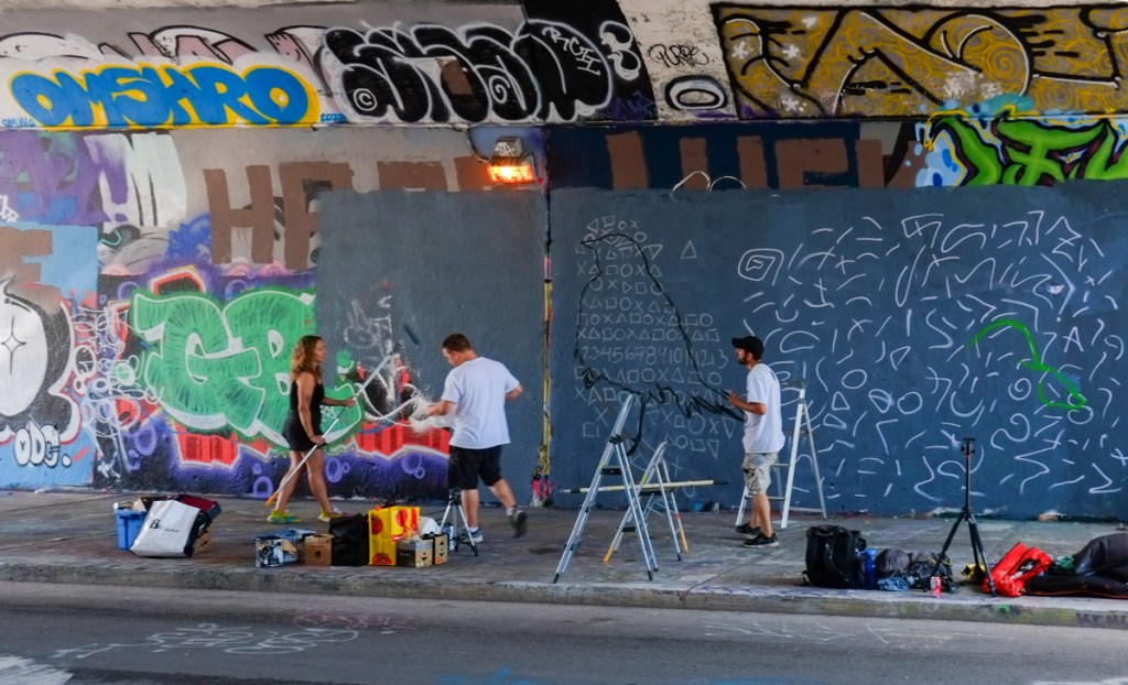 looking down rue Rouen in Montreal towards railway bridge, people painting the walls under the bridge