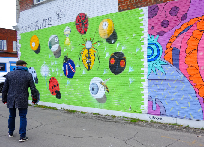 There is a new mural (2022) in Toronto by Nick Sweetman featuring animals and plant life commonly found along Ontario’s rivers, especially the Don River that flows nearby. It adorns a wall/fence that runs the length of a new park, Riverside Square, which is southeast of Queen and the Don Valley Parkway.