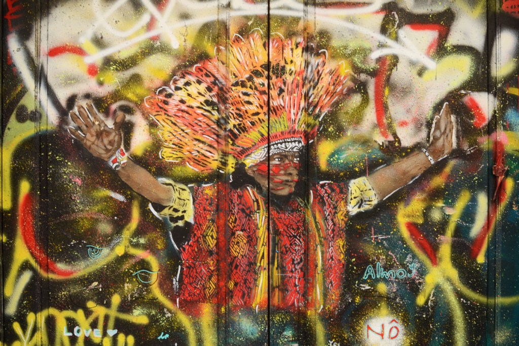 street art portrait by No on rue Denoyer in Paris, of an indigenous Australian man with arm upraised and holding a boomerang covered with aboriginal symbols and art