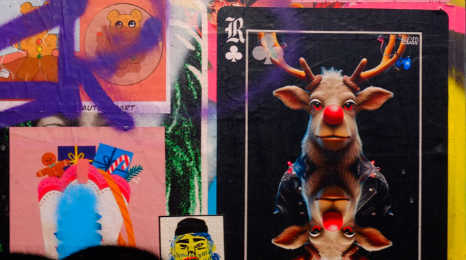 below: Two artworks, paper paste-ups. A woman’s portrait on top and a playing card style image of Jimmy Hendrix, the H of Hearts, below.