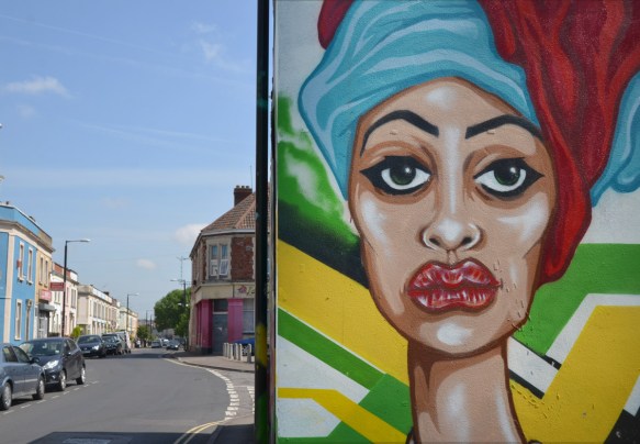 below: A large mural of a woman’s face in yellow and black, by Stinkfish, Stokes Croft, 2012
