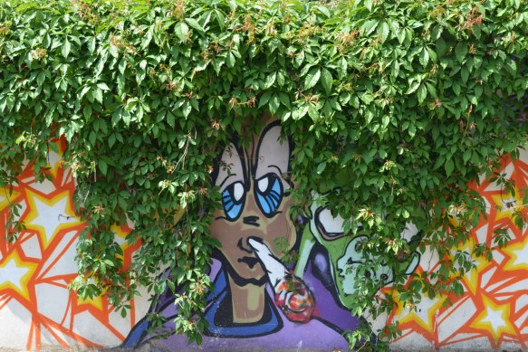 street art painting of a man with blue face, black hat and jacket and green pants