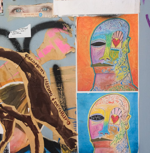 below: His burning inside produces enough hot air to keep him afloat. There is a word written on his T-shirt which might give some clue as to the artist who created this large paste-up but I haven’t been able to find any answers online.