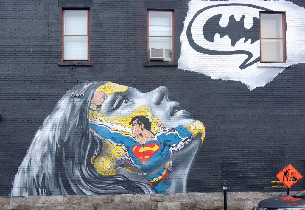 below: by Sandra Chevrier, pop culture references to Superman and Batman